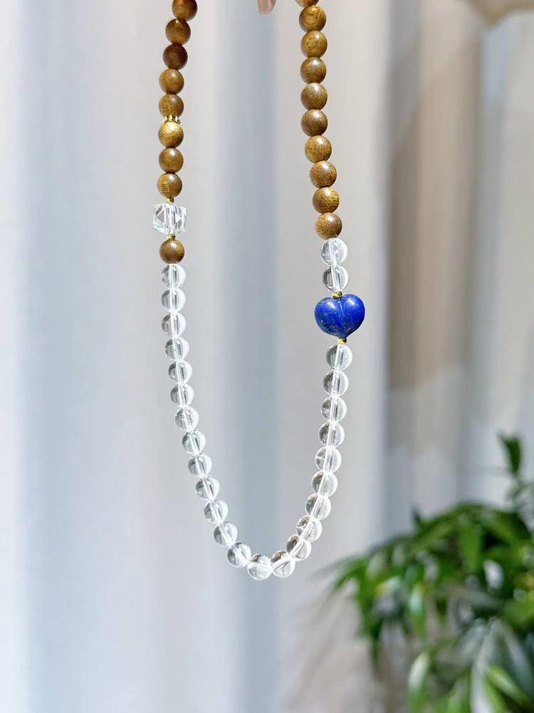 Materials: natural agarwood, clear quartz, lapis lazuli accent, alloy findings