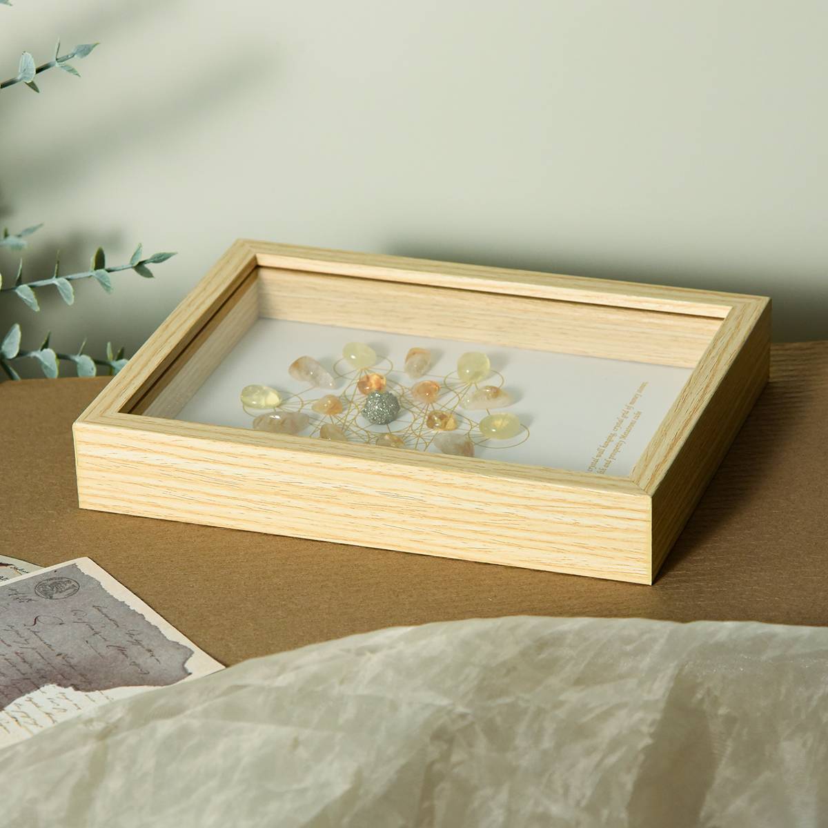 Materials: Natural gemstones arranged in a sacred-geometry crystal grid, set in a shadow-box wooden frame with protective cover.
